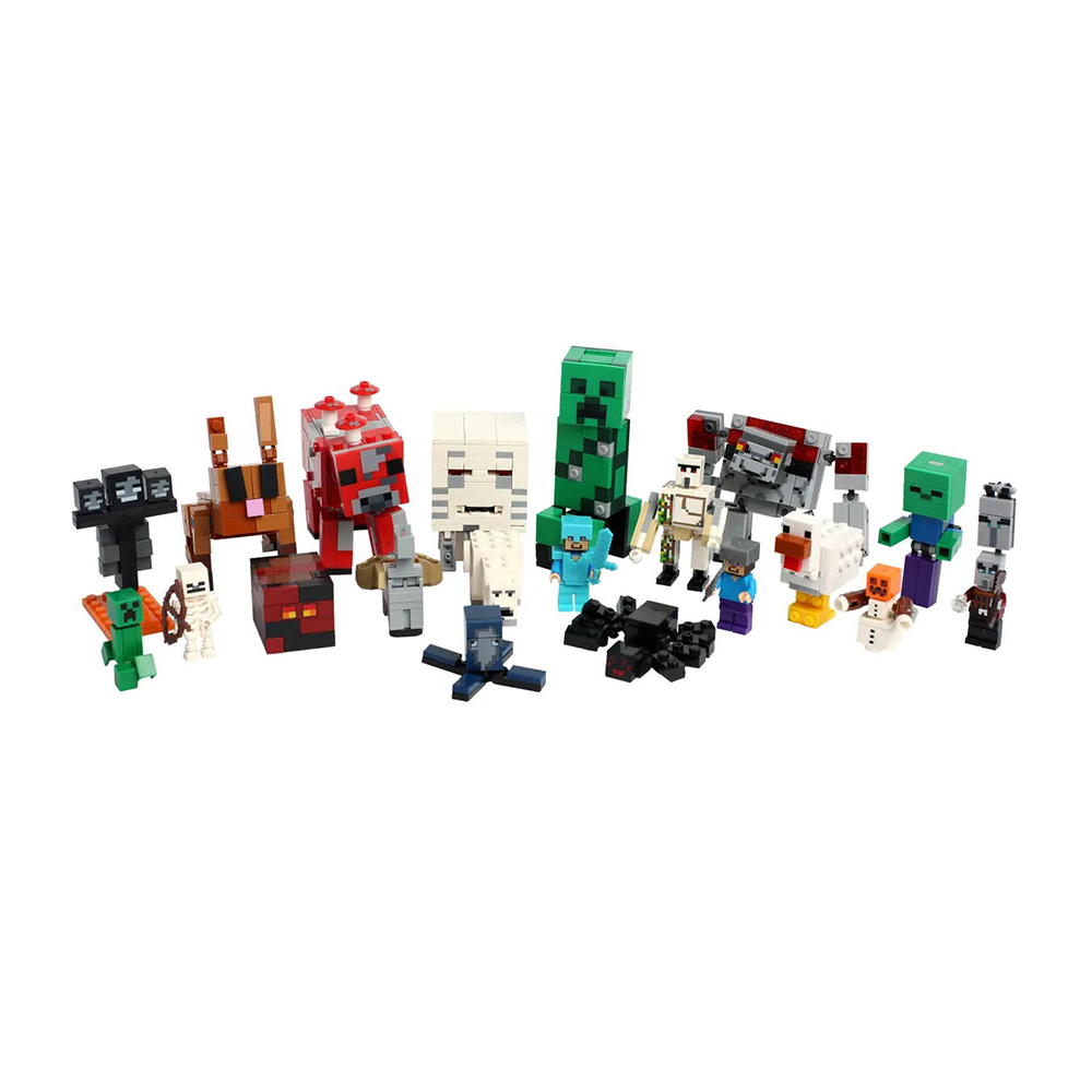 - В состав набора входитМагмовый куб, Железный голем, Белый медведь, Снежный голем, Паук, Маленький крипер, Стив, Скелет, Иссушитель, Стив в алмазной броне, Большой крипер, Спрут, Грибная корова, Курица, Зомби, Гаст, Разбойник, Чудовище Красного Камня, Кролик, Лошадь