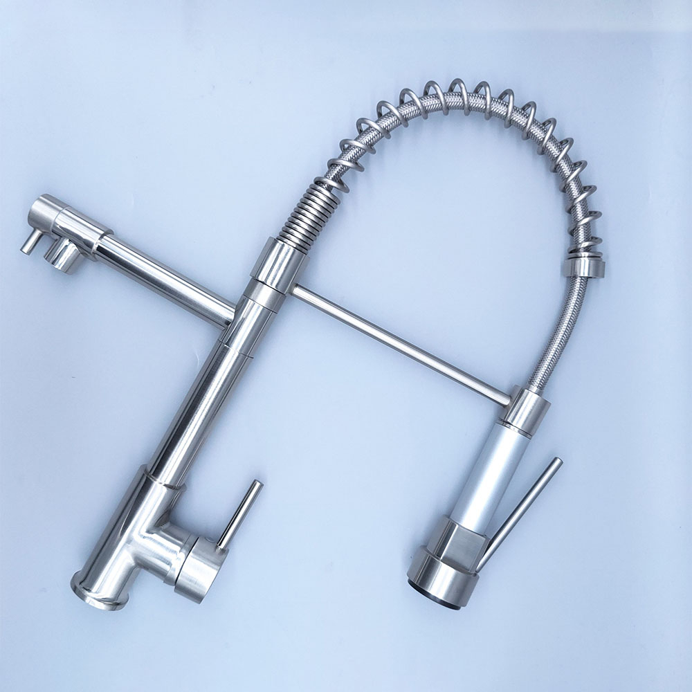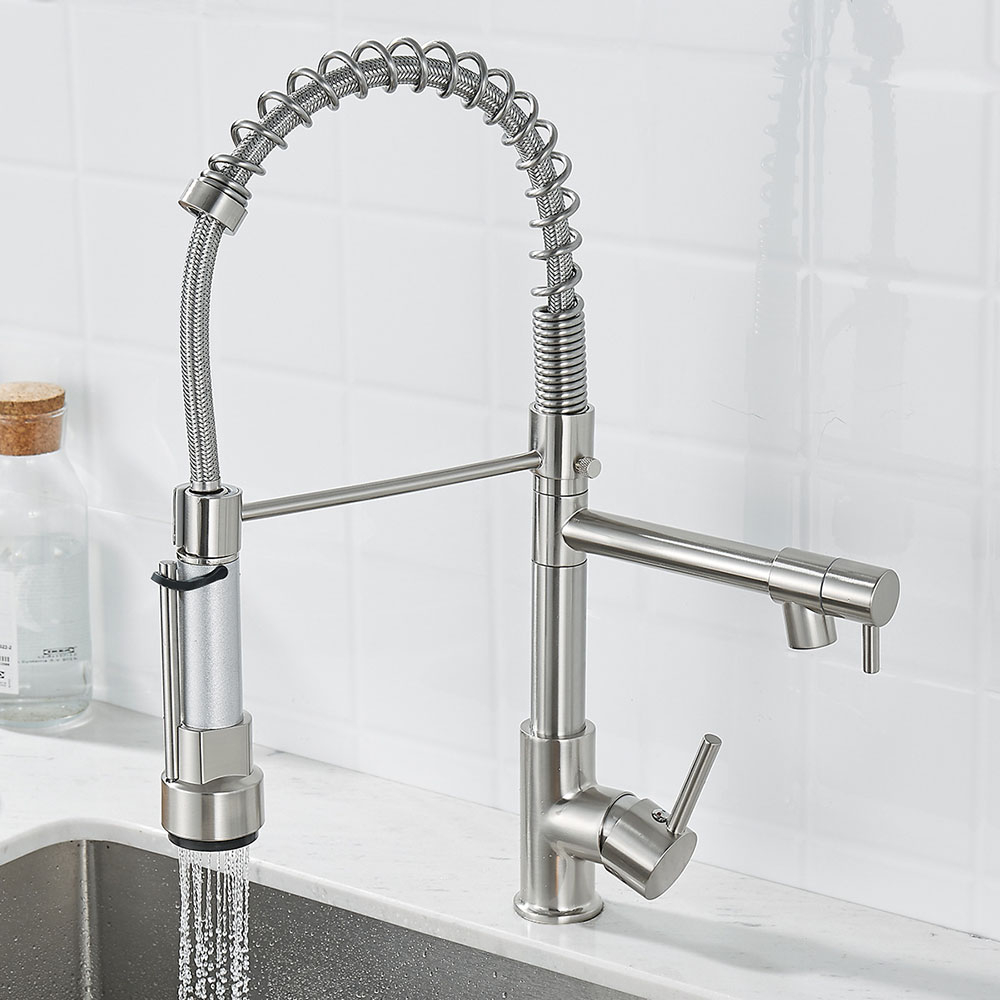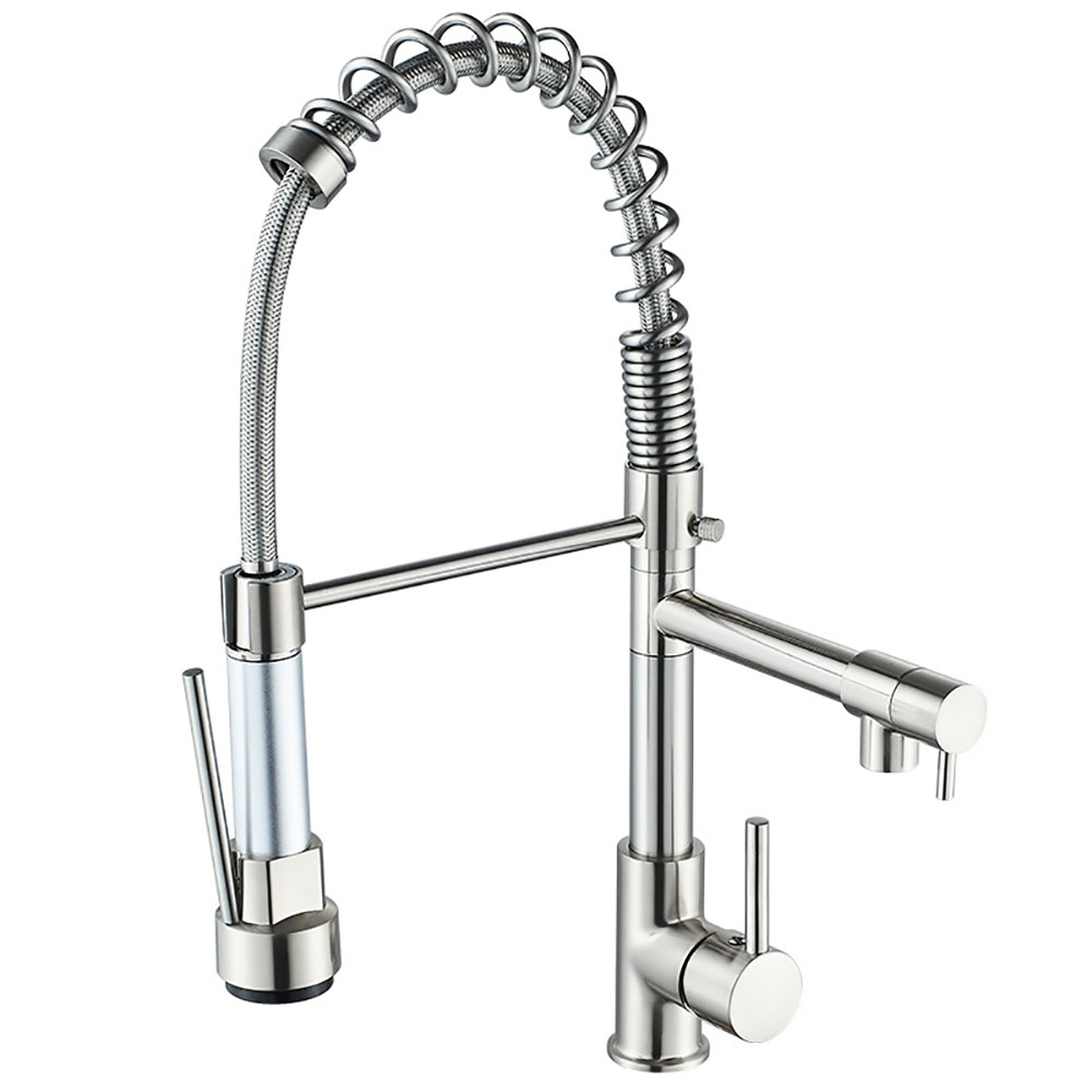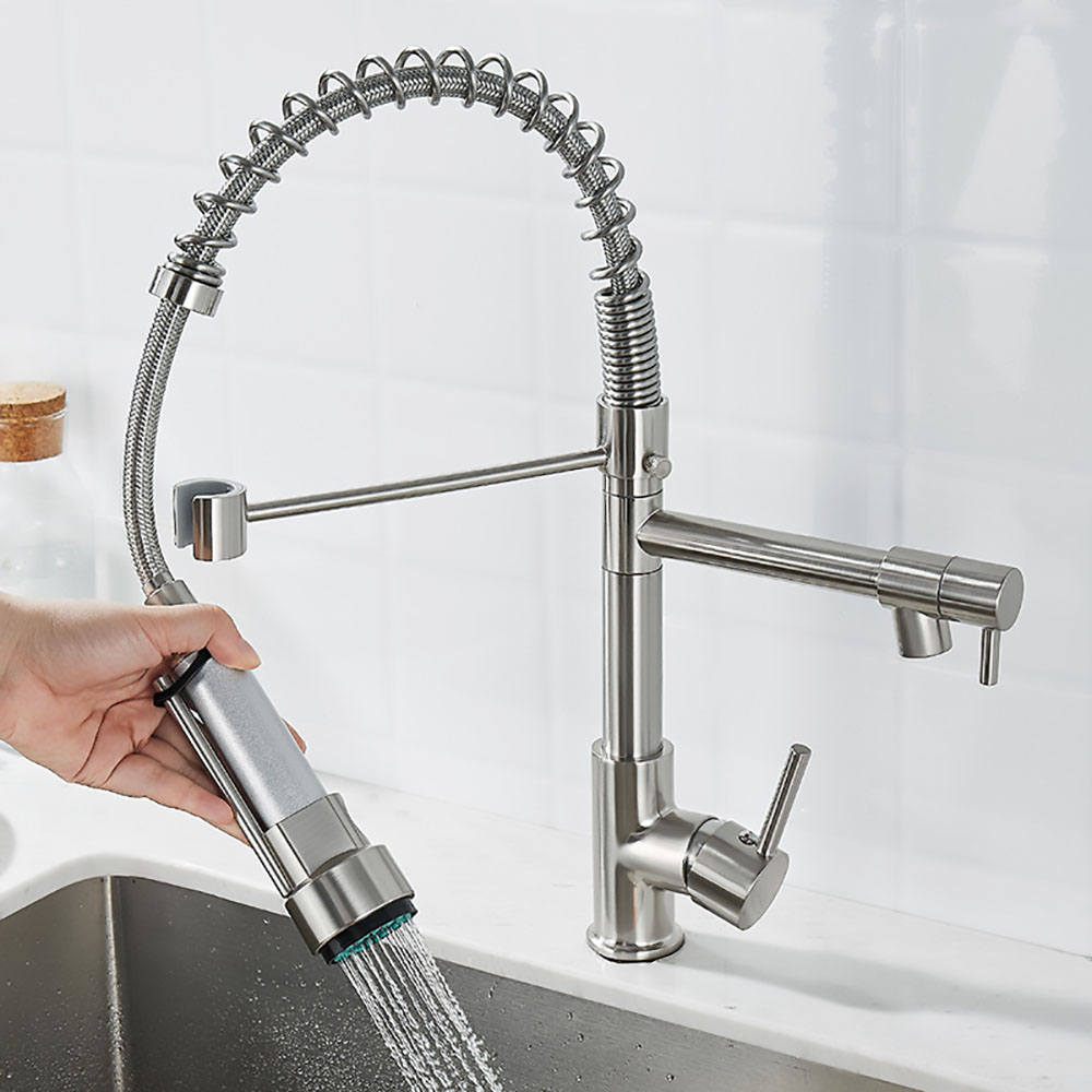 Гибкий смеситель для кухни с выдвижным изливом Mers TH668 для воды выполнен из металла в современном стиле. Смеситель для раковины управляется при помощи рычагов и нажима на управляющие элементы, которые не требуют особых усилий для переключения в нужный режим. Кухонный однорычажный смеситель имеет гибкую основу, за счет которой кран можно поворачивать в любом направлении для мытья овощей, очистки посуды, наполнения емкостей водой. Для фиксации подвижного крана в нормальном положении есть специальная стойка. Водяной кран для мойки с аэратором не боится ржавчины, загрязнений, царапин и механических повреждений за счет качественного покрытия.