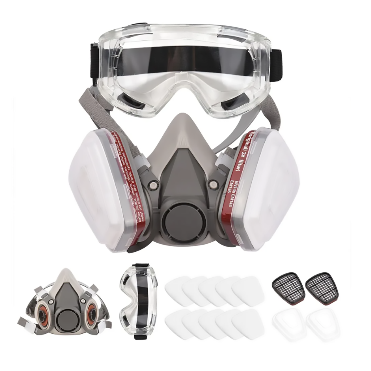 1 маска, 1 защитные очки, 2 фильтра 6001, 2 пластиковые крышки, 10 хлопчатобумажных фильтров.